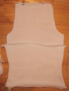 Looking at the back now, I'm thinking that the armholes, which I already shortened by one inch, still look a tad long. I'll most likely knit the front to what seems like the proper length and then change the back accordingly. Perhaps by then, I will have figured out the neck and shoulder bind off thing.