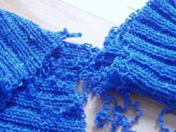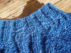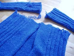 And finishing off the rip-a-thon, a little cool down exercise. Remember blue, my bumpy giboulees sweater that I knit half of using the wrong pattern? I've decided to stick with this pattern, but since I don't have enough yarn to do the big bell sleeves, I ripped out the sleeve that I'd started so I can reknit it straight. Ready for one last rip?!