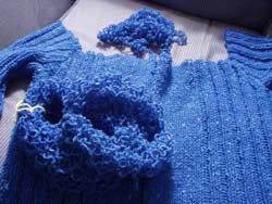 Can you hear the frogs? I believe Leigh's been doing some ripping. Knitsmith Carrie undid at least half her projects Friday night! And another Carrie reports having ripped 5 (FIVE!) projects in the most fabulous yarns (can you say Colinette....mmmmm). Leya sent this pic of her Rowan Polar sweater which has now been ripped TWICE. And speaking of double whammies: Jen will be joining us, ripping out her poncho from the ponch-o-long. Two knitalongs at once. Coooool!