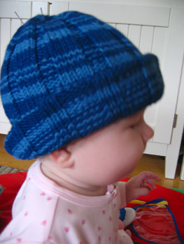 It's the striped denim hat from one of my fave books ever, Itty-Bitty Hats (it's the inside of the white denim hat with dots pictured in the book). It hasn't been washed yet, so it's still a little long, but it is such a handsome hat!