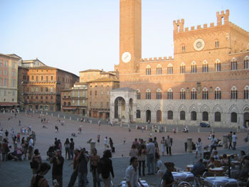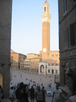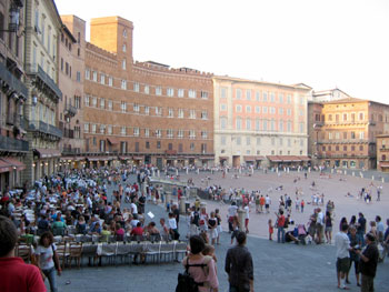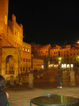 The piazza has a sloped ground (perfect for sitting and relaxing) leading down to the impressive Tower del Mangia. And there are restaurants and bars all around the piazza. We couldn't resist sitting down and enjoying a pizza and the cool evening air in this beautiful space.