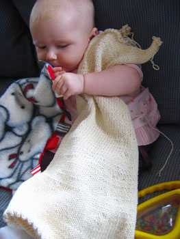 I've sized down the pattern to be about a one year size, but before washing it looks like a blanket next to a 5 month old wee one!