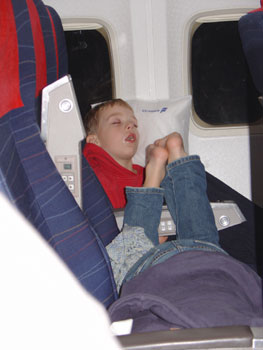 Later, with their children's meal, the boys each got a small bag with a coloring book and stickers and a plastic digital watch. S was so excited about the watch that he made me set the time right away and then gave me updates on the time every minute for the next five minutes in a happy sing-song voice. "It's almooost four o'clo-hock.... It's four oh one-hun..." I turned to roll my eyes at my husband and caught a glimpse of B who in some sort of jet lag induced punchy state had stuck about twenty of the stickers all over his face. I looked back at S. Asleep. And so they stayed until landing.