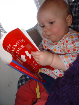 And once on the plane, wee one enjoyed my book (well, the cover at least) before settling in for a good nap.