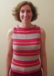 Hey, I only had the borders left to do (plus I'm cheating here a bit as the ends from the neck border are still hanging around on the inside)! I'm so glad that Kerstin encouraged me to try the edgings as written. I do like how they look and they did a good job flattening out the top part of the tank so it's not too revealing in the bra area. I also cast off fairly snugly to take in more of the roominess there. Now it fits perfectly! The neck edging is indeed rolling (as others had reported) both in front and in back, which is why I haven't sewn the ends in yet. I'm considering reworking the picked up stitches somehow or maybe weaving in the ends such that they tack the edge down. I'm simultaneously trying to convince myself to just leave it, because I'm really very happy with the overall finished tank (can't you tell?!) and am especially pleased at how those stripes came out. And since I can't get enough of stripes....