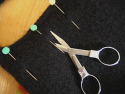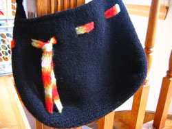 Yes, those are scissors. Yes, I am cutting sophie. No worries, I simply cut some slits evenly around the edge, so I could slide some pretty yarn through to bring a little color to my plain black sophie. (I got this idea from a pretty little bag we have at the store: the Felted Jelly Bag from Designs by Shelley.)