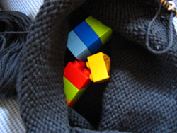 So, I'm knitting along on the bag and my almost 4-yr old son, S, comes up and asks me, "mommy, is that going to be a sweater?" Awwww. "No, it's going to be a bag," I reply. --"A hat?" --"No, a bag." --"A hat?" --"No, a BAG. --"Oh, a hat." --"Okay, yeah, it's a hat." What can you do?? His twin brother, B, came up a few minutes later. "Mommy, what's that?" "It's going to be a bag." Having learned from my earlier discussion with S, I added, "for putting things in." B said, "Like Legos?" --"Sure, like Legos." --"Oh, okay, I'll get some."
