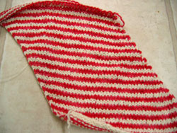 It's the beginnings of a Jilly scarf (the pattern is in the Free Pattern Archive for Rowan subscribers). My mom picked out the yarn, Manos Cotton Stria, last year on my first trip to Downtown Yarns. She loved the look and feel of the Stria and got a kick out of the red and the white together. We instantly thought candy cane stripes and I remembered that I had at least one pattern for a nice, stripy scarf (besides this one, there is a chunky-gauged version in Rowan Junior). We excitedly purchased the yarn. Then, as so often happens, it got tucked away for a year (to ripen? to cure? who knows what it does while we neglect it?). I did think about starting it several times, but have to admit that the thought of winding all those hanks into balls led me to tuck it away again and again. Now that the boys LOVE winding yarn (in fact, I like to have some yarn ready for winding in case the boys start to get wild and need a way to redirect their energies) and mom's birthday is once again approaching, it is time.