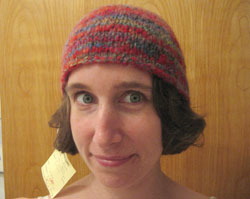Then I decided to try to make a hat a week in the remaining two weeks of my beginners' hat class. The first done was the Hogwarts striped hat that I showed you last week. I was tempted to make a second and keep them for the boys, but now that they'll be getting kool aid caps that they helped dye themselves, I can give this hat away, as intended. Then I quickly knit up another with a sort of marled look, knit with scraps of Elann's Peruvian wool and Rowan's soft baby held together. It is amazing how soft that soft baby makes the hat! And it's soooo warm.