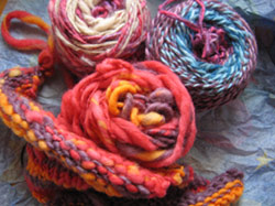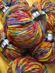 I've been winding yarn. Some handspun yarn, to be exact. Not spun by me, of course. Nope, winding is as close as I'll ever get. The handspun balls are two little mini-skeins of wool from misshawklet, that fellow Knitsmith Lisa found at the Bizarre Bazaar here in Boston, and a skein of angora/merino by Jamie Harmon that I found at Downtown Yarns. I had this idea of collecting a few random skeins of handspun for a long, funky scarf. I'm still looking for one or two more, but after seeing these fun yarns sit on my desk for months, I couldn't wait anymore to wind them up and get started.