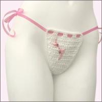 Did you know that you can rearrange the letters of "Kerrie and Wayne" to spell "naked yarn were I"? Well, now you do. And speaking of getting naked with some yarn, why don't we start the evening by trying on some crocheted thongs?! Come on, it'll be fun! We have to find a good one for Kerrie (hen party = panty her). Perhaps this one would do for our blushing bride.