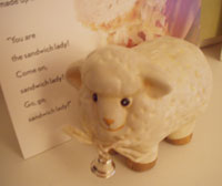 My secret pal sent me this cute little sheep, along with a funny card and some yummy Dora the Explorer chocolate for the boys (that's pronounced D-O-R-A around here - spelling it out is the only way to prevent the boys from thinking it's Dora time on tv. Seems like I've spelled D-O-R-A so many times that I can't even say the name anymore! Me to my husband: "How about the boys watch a little D-O-R-A while you get the P-I-Z-Z-A?" Me to my husband yesterday: "Oh look, my secret pal sent the boys some D-O-R-A C-H-O-C-O-L-ah, you know!"). Thanks, for the laugh, secret pal!
