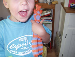 Note: for those who have asked or are thinking of asking, the giraffe toy pattern is from Phildar's Tricotez Calin #2 (spring/summer 2002). It's an out of print French pattern book and unfortunately, I've never seen any back issues of Phildar patterns available anywhere. It's not a difficult pattern to recreate though. The shape's pretty clear and you could place the stripes and spots wherever you like. Julia also suggested that this Fiber Trends llama pattern could be easily adapted to make a cute giraffe. She's made one and will post her pattern mods soon!