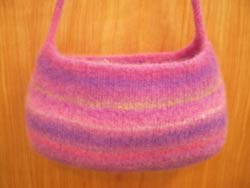 Here's the first sophie bag. It came out perfectly after felting. I stuffed some plastic bags in it to hold the shape as it finished drying and now need only to sew in a snap. What a great little pattern! I enjoyed it so much that I immediately searched through my stash to find more wool. And what do you know, I had about a ball and a half of Kureyon left over from my new year's stripey sweater. It wasn't enough for a full-sized sophie, but I like it as a short, rectangular bag too.