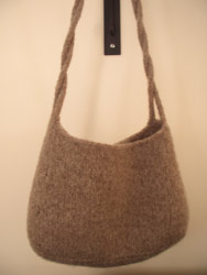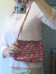 How perfect? Take a look back at the Knit Happens coin purse. Or Monica's purse. And check out CurlyQ's free Daria bag pattern. K2P2 offers a free knitted bag pattern on their site. And Purl also had a little bag made out of the Daria on display, which looked like this bag (kit available through Royal Yarns). But I'm now obssessed with an idea of Elisabeth's to make Annie Modesitt's Aline bag pattern with it. Cool or what? Um, Elisabeth, I may need more of that yarn....