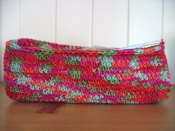 While I was at my local yarn store, buying a few goodies for some friends, a little siren voice led me right over to this lovely. It's Daria multi, a nylon cord yarn by Noro. Aren't the colors amazing?! And it feels so fabulous. I'd been visiting and fondling the one skein at my LYS for a few weeks, telling myself that I couldn't do anything with just one skein. Well, I found two more skeins this time! My excuse no longer being valid, I had to get them. Just as I started thinking how silly I was to have splurged for the Daria and how my idea of making a crocheted bag out of it could be really stupid, I found this online. Oh yes, crochet happens!