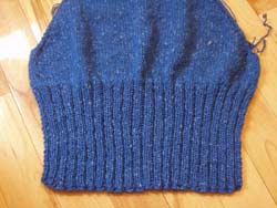 Sew it up. Pick up 64 st. around neck for turtleneck. Work neck in 2x2 rib as long as you want (I had enough yarn for 8") and bind off in pattern.