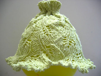 I knit the hat from the top down, just like the embossed leaves socks (from Interweave Knits Winter 2006 and Favorite Socks ), so the leaf pattern has the same direction and same beautiful shape, and I chose a relatively fine-gauged yarn to maintain the delicate look of the leaves. Since it is an openwork lace pattern, I decided it should be a summer hat in cotton and widened the brim for some shade for baby's face. I also added little picots to the bind off edge to accent the leaf motif. The top ribbing is cinched in, pulling the leaf stems together bouquet-style into a tidy bundle.