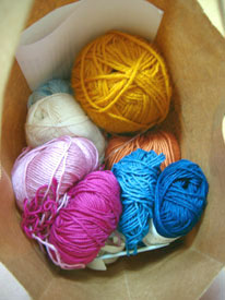 Here's the rundown: red - Frog Tree Merino; purple: Anny Blatt Merinos; gray - NatureSpun Sport; brown: uuuh, maybe Elsebeth Lavold Chunky AL?; orange - Classic Elite Princess; yellow - Cascade 220 Superwash; black - Classic Elite Bazic; green: Nashua Julia; blue: Manos del Uruguay. The gauges are a bit different but the colors are so perfect that I've gotta make it work. This is going to be fun!