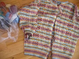 Claudia was giving this away. (I'll pause for a moment for you to take that in. Yes, she was giving it away!) She'd worked on this giant 80's style fair-isle back in the day and was never going to finish it. She said that someone unafraid of steeking should take it and cut it up and make something (pillow cover, felted bag...) out of it. How could I pass that up?! Just look at that incredible corrugated ribbing. I'm so excited about cutting this baby!