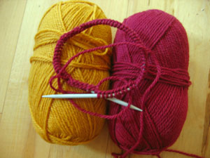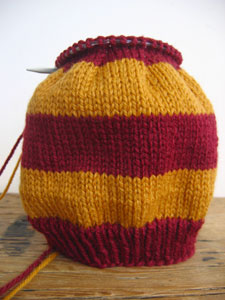 Well, I'm a week behind in my goal to knit a hat a week for Caps 4 Kids during my beginning knitting class. I'm just finishing the first hat - a striped Harry Potter hat. This Patons Classic Merino fcomes in great Gryffindor colors, don't you think?
