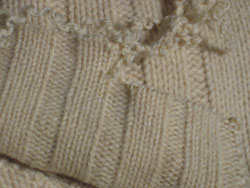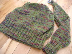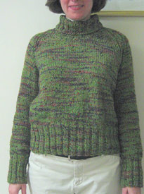 Sew it up. Pick up 64 st. around neck for turtleneck. Work neck in 2x2 rib as long as you want (I had enough yarn for 8") and bind off in pattern.