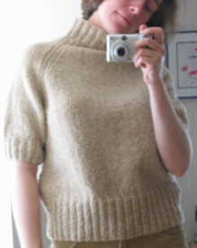 This is another older shop model that I picked up in my LYS's sale bin. It fits me perfectly! When I first saw the sweater on display in the store a couple years ago, I immediately bought the book because I wanted to make one for myself. I never got around to knitting the sweater, but actually I'm glad of that now. I would never have thought to knit the short-sleeved version of the sweater, but it's really comfy to wear. The wool is warm enough that it seems to make up for my arms being bare. It's making me rethink all those charming short-sleeved "vintage" sweater patterns that I discredited in my mind as impractical. Cause I like this one. I really like it.