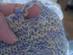 Sure, I could pick up that stitch, patch up that hole, but everything around it is about to go. I'd be fixing another spot in less than a week (and even worse, just look at how thin some of the yarn is in some of the first pattern rows below the edging!). Nope, the entire edging and last pattern repeat had to go.