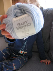 Of course there was no variegated Baby Merino DK to be found round here no more, but we found some in blue that B approved of.