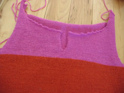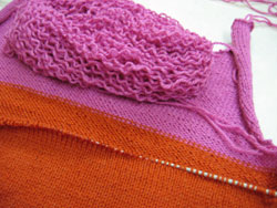 But before I go back and fix the front yet again, I decided to tackle the back. When I first finished the sweater I noticed that although the measurements were good, it rode up a little while I had it on, so my February fix-it plan was to invent a new neckline and go back and add an inch before the armhole shaping on the body and before the sleeve cap on the sleeves. Since the front is in time out AGAIN, I ripped out the pink of the back and am starting the re-knitting there.