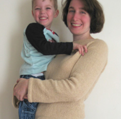 Before I rip out the rest of my old Banana Republic sweater, I took note of the gauge and actual measurements of the original sweater (as suggested by Kristi's very helpful page on recycling yarn from old sweaters). The boys were happy to oblige when I needed an object for scale.