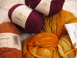 That's one more skein of Malabrigo for the clapotis (yes, I will need four skeins), one more ball of asc for katy (the cables are eating up yarn at an alarming rate), and five balls of Calmer in maroon for the nothing but a t-shirt that I'm making with my intermediate knitting class (I liked the maroon trim on the model tee so much I wanted to use it for my next NBaT). The bag of yarn was like an accidental cross-section of all the projects I'm working on now and what do you know, it looked like another Harry Potter scarf. (Mmmm..... a Harry Potter scarf in Malabrigo.... drool... ooops, sorry, drifted off there a bit). It would appear that I officially have Harry Potter on the brain. And the needles.