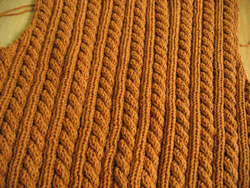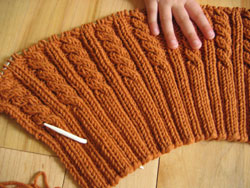 First up is katy, my lovely copper cabled sweater. The body is all done, but both sleeves still remain to be knitted. I cast on for the first sleeve at Knitsmiths on Sunday, but had to rip it about an hour later as it seemed a little snug on the wrist. I'm not a fan of the narrow wrist/wide upper arm sleeve shaping thing. Plus, I'm not convinced that I have enough yarn left to complete two full-length sleeves. After considering my options, I decided to cast on about 85% of the stitches that the pattern calls for at the widest part of the sleeve and knit it straight.