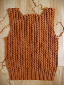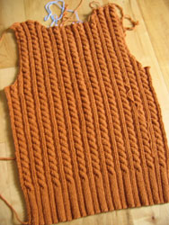 Let me just interject here how incredibly annoying it is that Debbie Bliss hasn't given knitters any help in this pattern regarding how do all the decreases along the armhole or that long v-neck. There's cables and ribs and a lot of seaming and picking up of stitches to be done later and if you simply decrease at the edge, it's gonna be UG-LY! I kept one selvedge stitch in stockinette all the way up, doing all decreases in pattern one stitch in from the edge. This certainly helped, giving me a clean, straight edge for seaming, but something like the clever lines of decreased ribs that you always see in the Rebecca patterns might have been nicer.