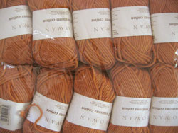 Next, I've got Lisa to blame, um, thank for renewing my love affair with Rowan all seasons cotton. Lisa gifted me with this bag of beautiful orange/gold asc. I've got plans to do something cable-y with it (like this maybe), because asc looks so damn good in cables! Afterall, it was Amber's incredible cabled sweater that sparked my last asc crush.