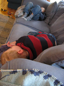 Why, it's my boys, who gave up afternoon naps at least a year ago, passed out on the sofa in the middle of the day! Must have been all the doughnut hockey. As you can see, I wasted no time pulling out the needles and made good use of the quiet moment to work on my magknit design.