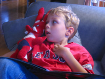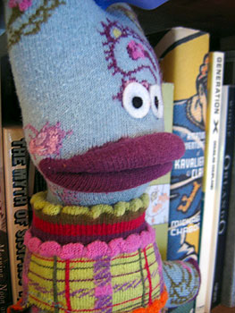 I did a much better job on Jordan after having learned all the construction basics on the first sock monster I made for S. (By the way, S's monster was "Wronky" in the book, but he's decided to call him Gordi.) Once you've made one of these, you can really make any of them. The instructions in the book are so good and so clear and the creatures come out looking so great! The boys couldn't be more thrilled about them. S keeps Gordi with him all the time. Yesterday after school they were hanging out reading the Lego catalog and watching "Dirty Jobs" together.