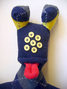 Now to stuff him and give him a face. This is the coolest part! S wants three eyes, buck teeth and a sticky-outy tongue. And then there's the neat trick of making the lips out of the heel of the sock. I'm totally having fun with this!