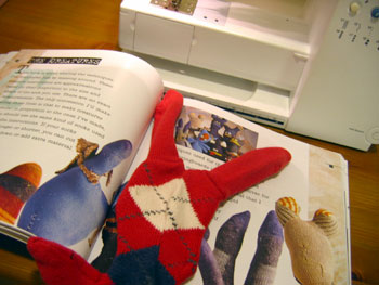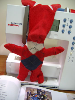 Don't worry that only wee one is benefiting from my recent sewing activities. Now that the machine is out again and I've remembered how to use it, I thought it was only right that I dig out those Stupid Sock Creatures I promised to make for the boys last Christmas. I'd already cut out all the pieces but I had to reread all the sewing instructions before I could get going.