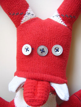Once again, I am amazed at the difference a little stuffing and face detailing makes on a toy like this. Do you remember how he looked before?! After our discussion last time, I did also made some adjustments to the ears and arms so they were a little less phallic looking. I think he's come out pretty PG overall. S thinks he's hilarious and does a funny laugh every time we look at him.